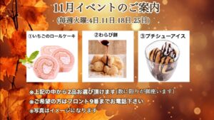 ①いちごのロールケーキ ②わらび餅 ③プチシューアイス